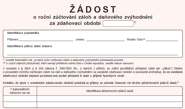 Máte-li zájem, aby vám zaměstnavatel provedl roční zúčtování, musíte jej prostřednictvím formuláře „Žádost o roční zúčtování záloh a daňového zvýhodnění za zdaňovací období“ požádat, a to do 16.2.2026 (po tomto datu již nelze o roční zúčtování požádat). Zároveň je nutné do tohoto data doložit potřebné podklady ke zpracování: